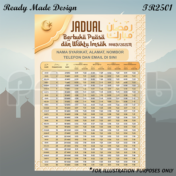 Get ready for the holy month with a beautifully printed Takwim Ramadhan Malaysia – a customised calendar showing the official Imsak and Iftar times for each state in Malaysia. Perfect for distribution by mosques, suraus, businesses, schools, or NGOs during Ramadhan.